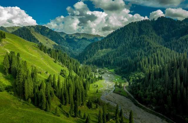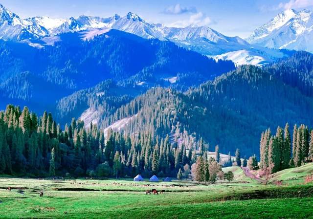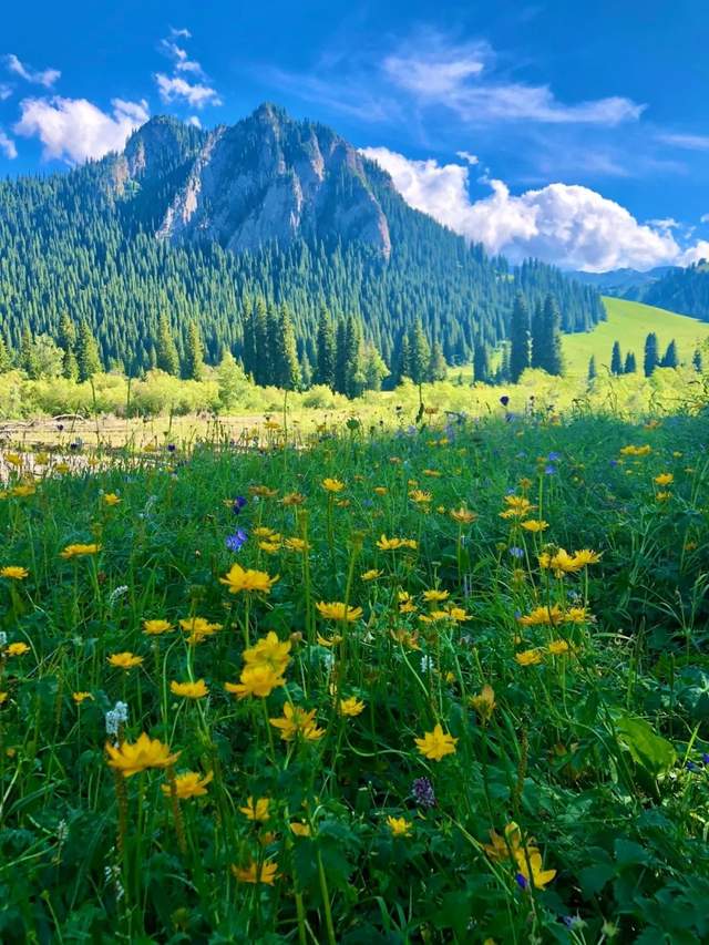 唐布拉草原位于喀什河上游南岸阿吾拉勒山北坡唐布拉溝內(nèi);唐布拉草原是伊犁地區(qū)著名的草原之一,風(fēng)景優(yōu)美,當(dāng)沿著喀什河谷溯源而上,行至唐布拉溝口時(shí),喀什河谷地形開(kāi)闊,兩岸河流階地十分發(fā)育。河流階地豐茂的草原上百花盛開(kāi),然而只有進(jìn)入唐布拉溝內(nèi)才開(kāi)始見(jiàn)茂密的云杉林。