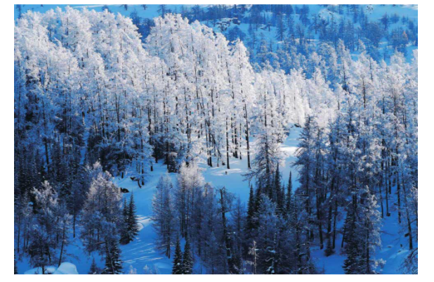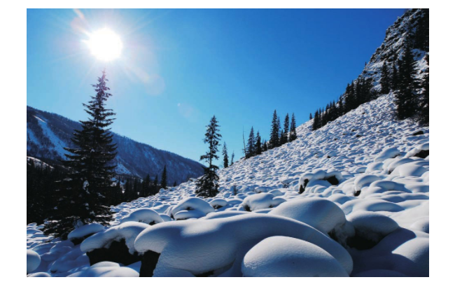雪后的禾木很少有人拍攝,但是卻有不一樣的美麗。逆光拍攝,采用對(duì)角線構(gòu)圖,近處雪堆形成的弧線非常柔美,也具有立體感。