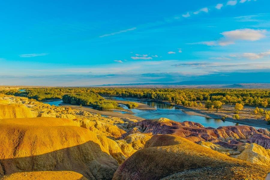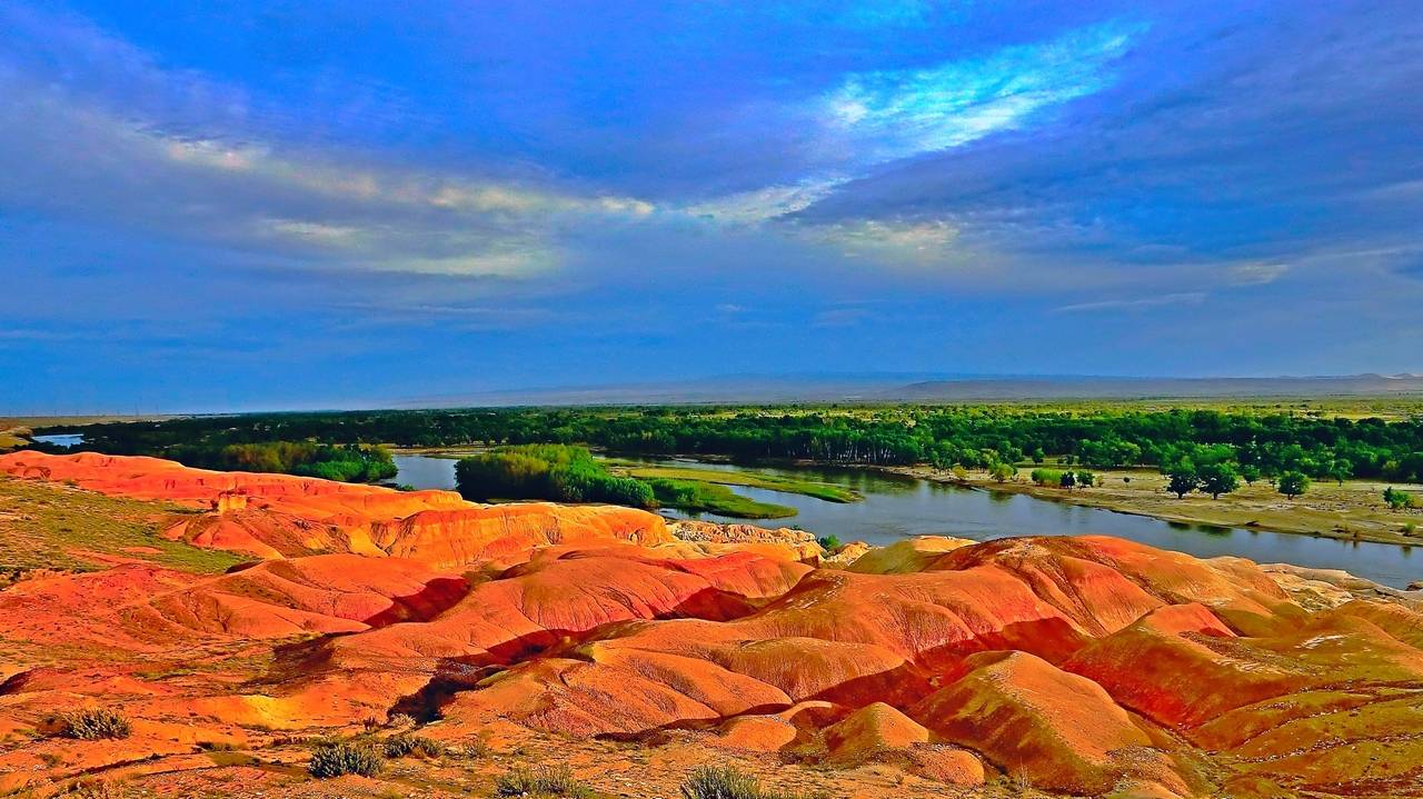 它毗鄰碧波蕩漾的額爾齊斯河,與對岸蔥郁青翠的河谷風(fēng)光遙相輝映,可謂“一河隔兩岸,自有兩重天”。激猛的河流沖擊以及狂風(fēng)侵蝕,形成了北岸的懸崖式雅丹地貌,河岸巖層抗風(fēng)化能力強(qiáng)弱不一,輪廓便會參差不齊,而巖石含有礦物質(zhì)的不同,又幻化出種種異彩,因此得名“五彩灘”。而南岸卻是綠樹葳蕤,連綿成林,遠(yuǎn)處逶迤的山巒與戈壁風(fēng)光盡收眼底。
