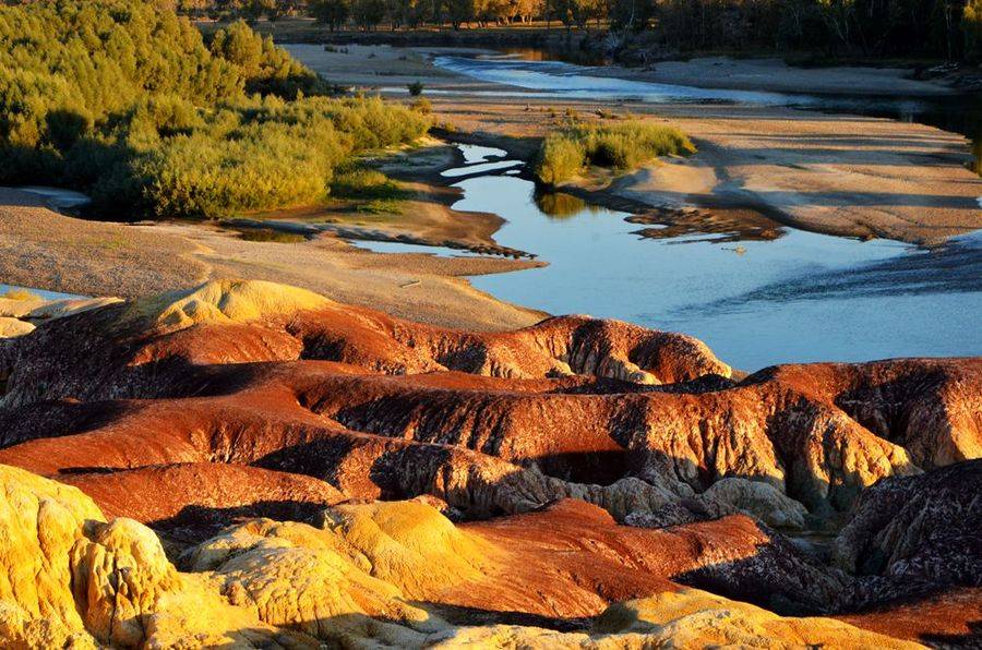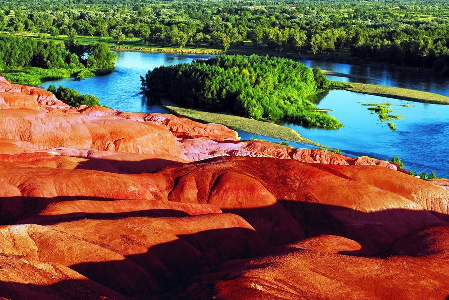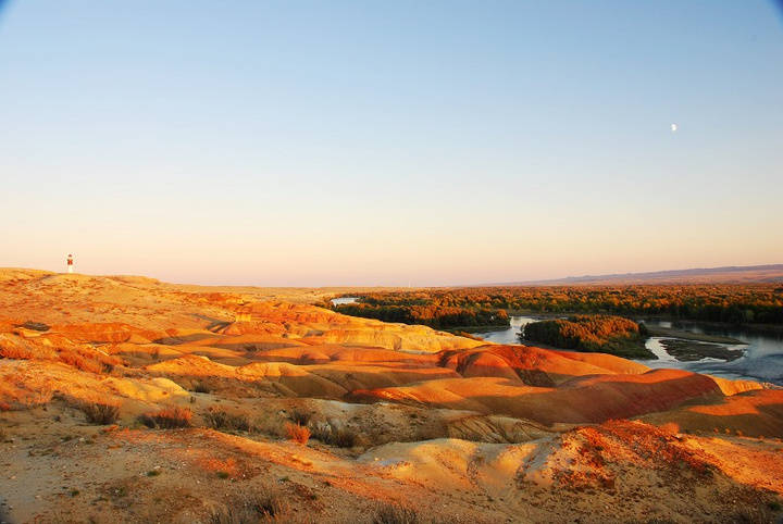 五彩灘的特別,還由于它色彩絢爛,形狀繽紛。因為這里有侏羅紀(jì)時代的煤層,經(jīng)過千萬年風(fēng)蝕雨剝以及河水的沖刷,在幾乎寸草不生的河灘上出現(xiàn)了紅、綠、紫、黃、棕等鮮艷的色彩。在河水的映襯和夕陽的照射下,當(dāng)你走進(jìn)這高低起伏的“ 丘陵 ”地帶,就如同走進(jìn)一個五彩斑斕夢幻般的世界,那些光怪陸離的色彩從四面八方撲面而來,都是那么明快、那么強(qiáng)烈、那么豐富多彩,真讓你感到目不暇接,眼花繚亂。