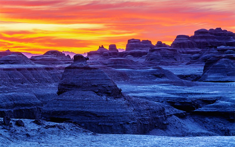 千百萬(wàn)年來(lái),由于風(fēng)雨剝蝕,地面形成深淺不一的溝壑,裸露的石層被狂風(fēng)雕琢得奇形怪狀,有的像宮殿,有的像金字塔,有的像雄鷹展翅,千姿百態(tài),令人浮想聯(lián)翩。就連許多電影都把魔鬼城當(dāng)作了外景地,比如《臥虎藏龍》、《七劍下天山》就是在這里拍攝的。