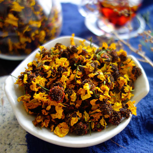 雪菊,學(xué)名兩色金雞菊(Coreopsis tinctoria)、蛇目菊,為菊科金雞菊屬(Coreopsis)多年生草本植物,在我國(guó)新疆尤其是和田地區(qū)、云南部分地區(qū)有一定規(guī)模栽培。因其能夠生長(zhǎng)在海拔3000m以上的新疆昆侖山積雪高山區(qū)域而得名“雪菊”。由于湯色紅,亦名血菊。