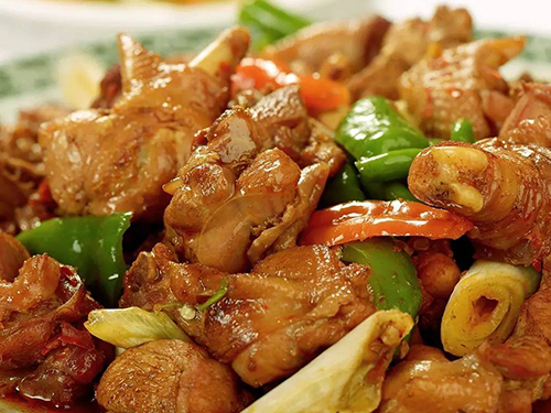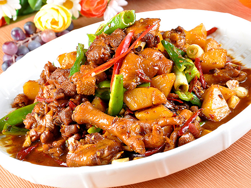 新疆大盤雞是新疆地區(qū)名菜,大約起源于80年代后期,主要用料為雞塊和土豆塊,配皮帶面烹飪而成。新疆大盤雞色彩鮮艷,有爽滑麻辣的雞肉和軟糯甜潤的土豆,辣中有香,粗中帶細,而且經(jīng)濟實惠,親朋聚會食用尚家。