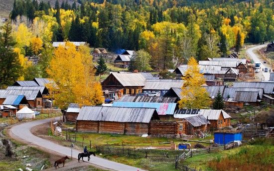 阿爾泰山上密密麻麻的金黃金黃的松樹林一直延伸到白哈巴村里,村民住的木屋和圈養(yǎng)牲畜的柵欄錯(cuò)落有致地散布在松林和樺林之中,安寧、祥和。